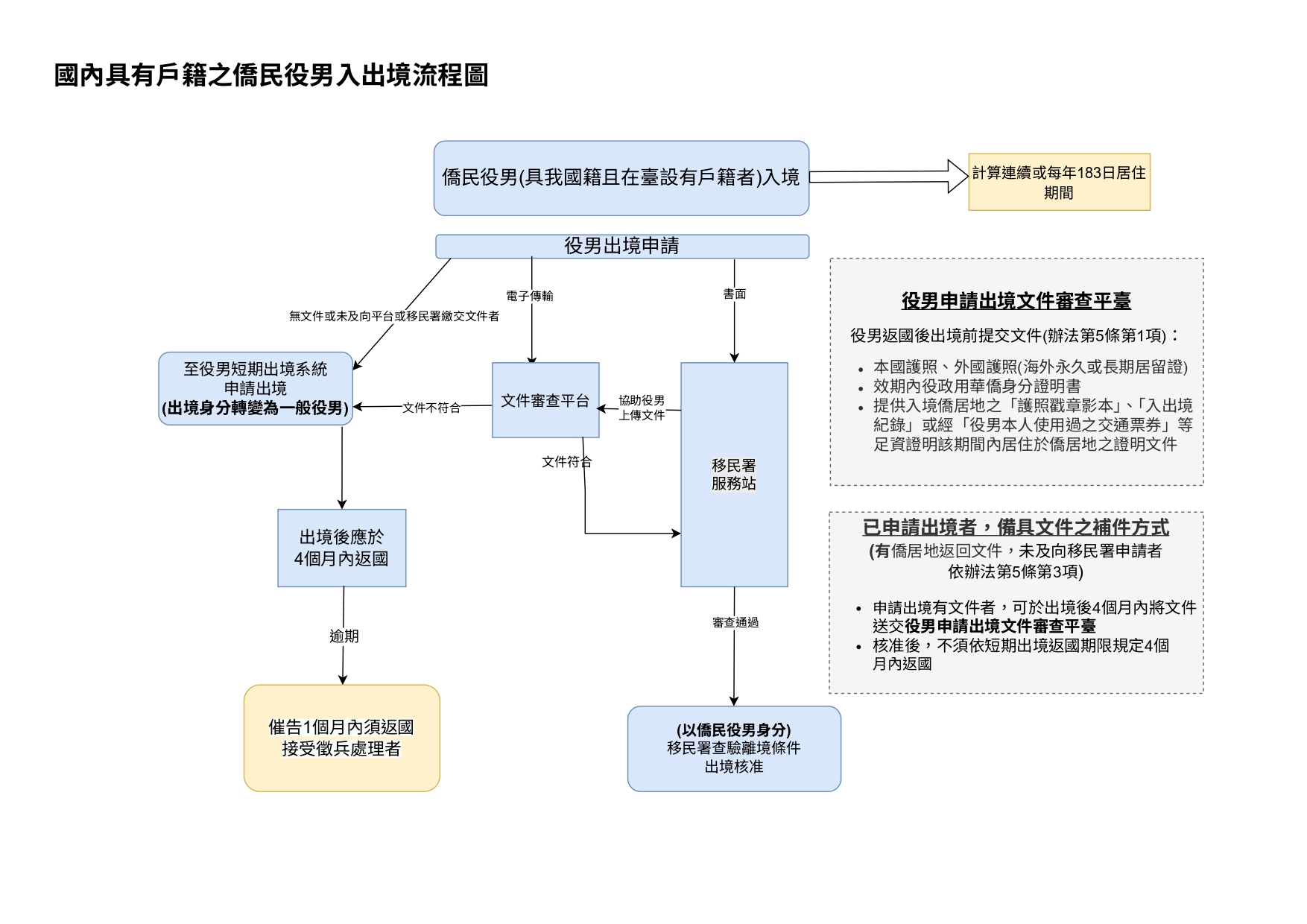 另有關僑民役男徵兵處理原則及入出境申請等相關資訊,請至役政司全球資訊網(https://dca.moi.gov.tw/)首頁/僑民役男查詢。