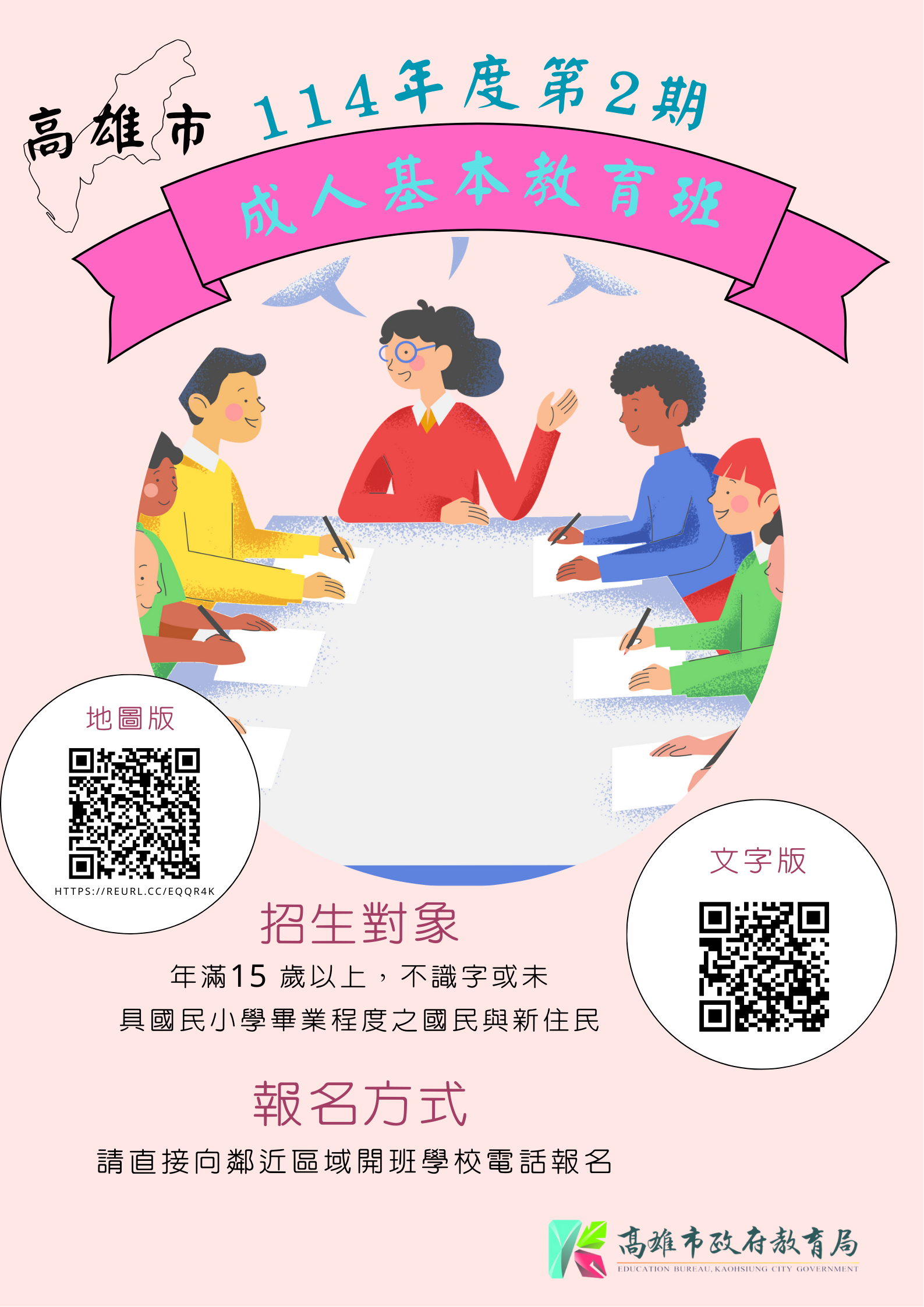 高雄市政府教育局辦理114年度第2期成人基本教育班,對象為年滿15歲以上,不識字或未具國民小學畢業程度之國民及新住民,招生資訊https://www.kh.edu.tw/people/link_learning/link_adult_edu。